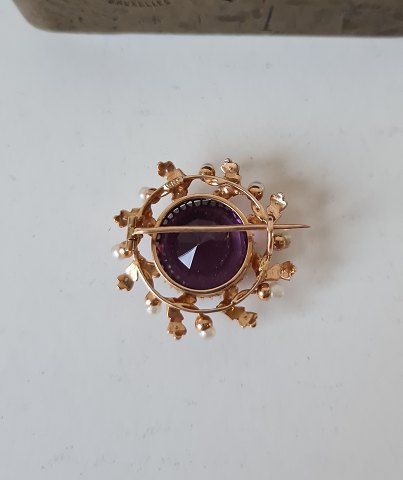 Vintage broche i 14 kt guld med stor ametyst omkranset af små perler. Stemplet 585 Diameter 3 cm. Diameter på ametysten 15 mm.