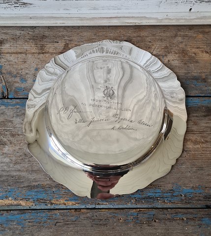 Dækketallerken af sølv fra 1953 Stemplet de tre tårne 1953 Fremstår med gravering på badsiden - se billed Diameter 28 cm. Vægt 455 gram.