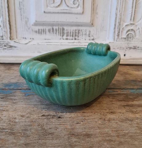 Michael Andersen riflet skål med hanke i smuk grøn farve Mål 12 x 20,5 cm. Højde 8 cm. Fremsår med mikro glasur chip.
