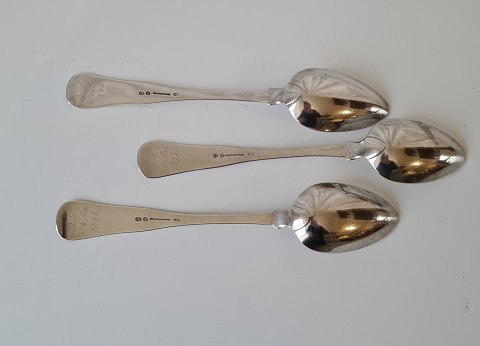 Set of three antique silver spoons from 1845 by H.L.Scmidt Copenhagen 1803-71 Stamped: H.L.Scmidt - the moon-marked scorpion - the three towers 1845 Length 22.8 cm.