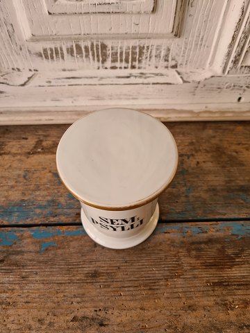 B&G Apotekerkrukke i hvidt porcelæn med guldkant og sort skrift