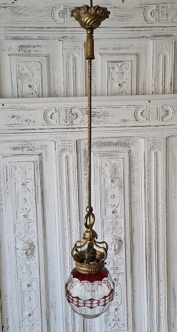 Smuk hall lanteren i Böhmisk krystal med forgyldt montering Længde 88 cm. Diameter på glaskuplen 16 cm.
