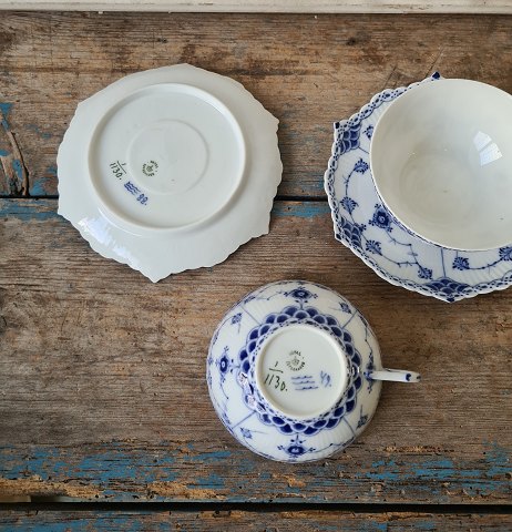 Royal Copenhagen Blue Fluted full lace teacup No. 1130 Measures on the cup itself: Height 5 cm. Diameter 10 cm. Measures on the saucer: 15 cm. Produced between 1898-1923