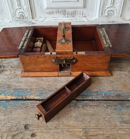 Engelsk tobaksskrin i lakeret egetræ med messing montering.