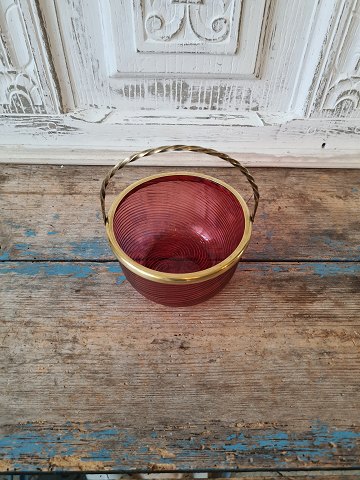 1800 tals sukkerskål i hindbærfarvet/lyserød/rosa glas med messingmontering Højde 7,5 cm. Diameter 12 cm.