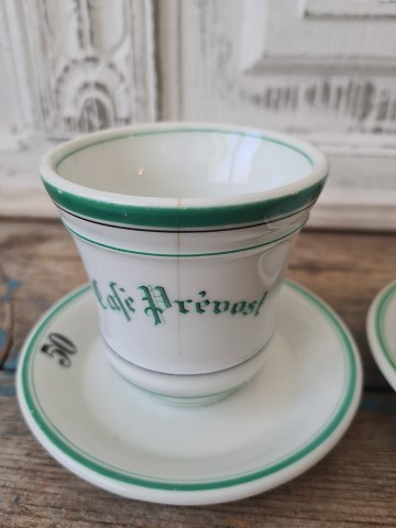 Par franske café brûlot kopper i kraftigt jern porcelæn dekoreret med grønne striber samt teksten Café Prévost |