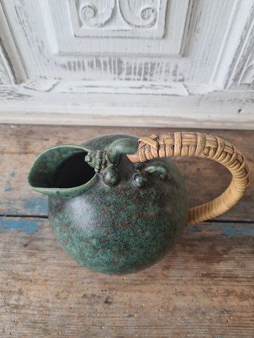 Arne Bang kande med bast håndtag. Kanden har en utrolig smuk grøn glasur. Signeret AB - 151 Højde 17 cm. Fremstår fejlfri