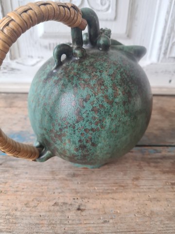 Arne Bang kande med bast håndtag. Kanden har en utrolig smuk grøn glasur. Signeret AB - 151 Højde 17 cm. Fremstår fejlfri