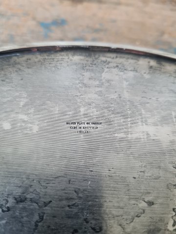 Oval silver plated tray with gallery edge, the tray stands on small "ball and claw feet" Stamped: Silver plated copper - made in Sheffield England Measurements 30 x 45.5 cm. Height 6 cm.