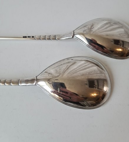 Par danske serveringsskeer i sølv fra 1883 af Amsel Moses Halberstadt