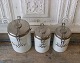 Gamle kaffe - te - kakao dåser i mælkeglas Mål: Kaffe: Højde 15cm. Diameter 11cm. Te - kakao: Højde 13cm. Diameter 8,5cm.