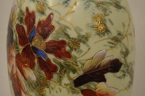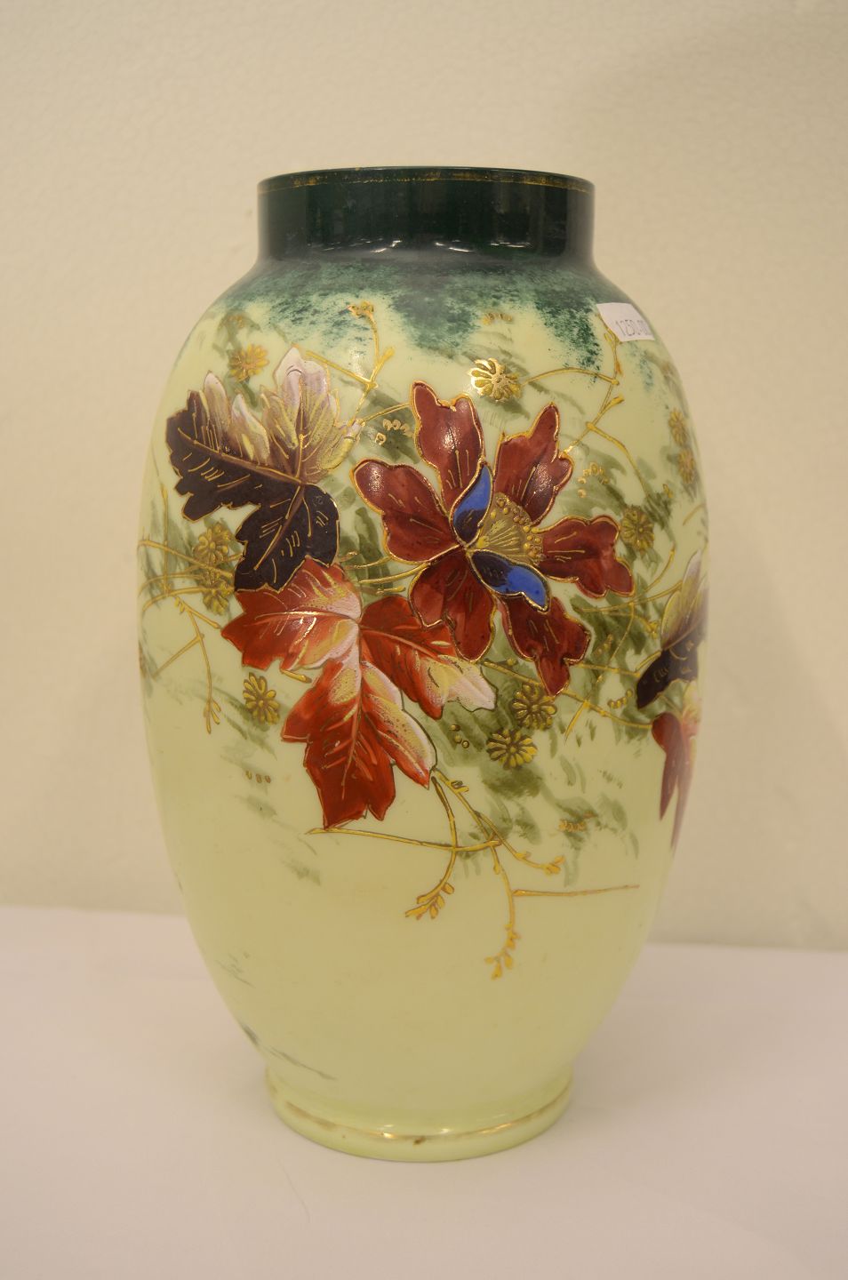 Meget velholdt antik glasvase i farven opalhvid bemalet med smukke blomster dekorationer og guldstrejf.