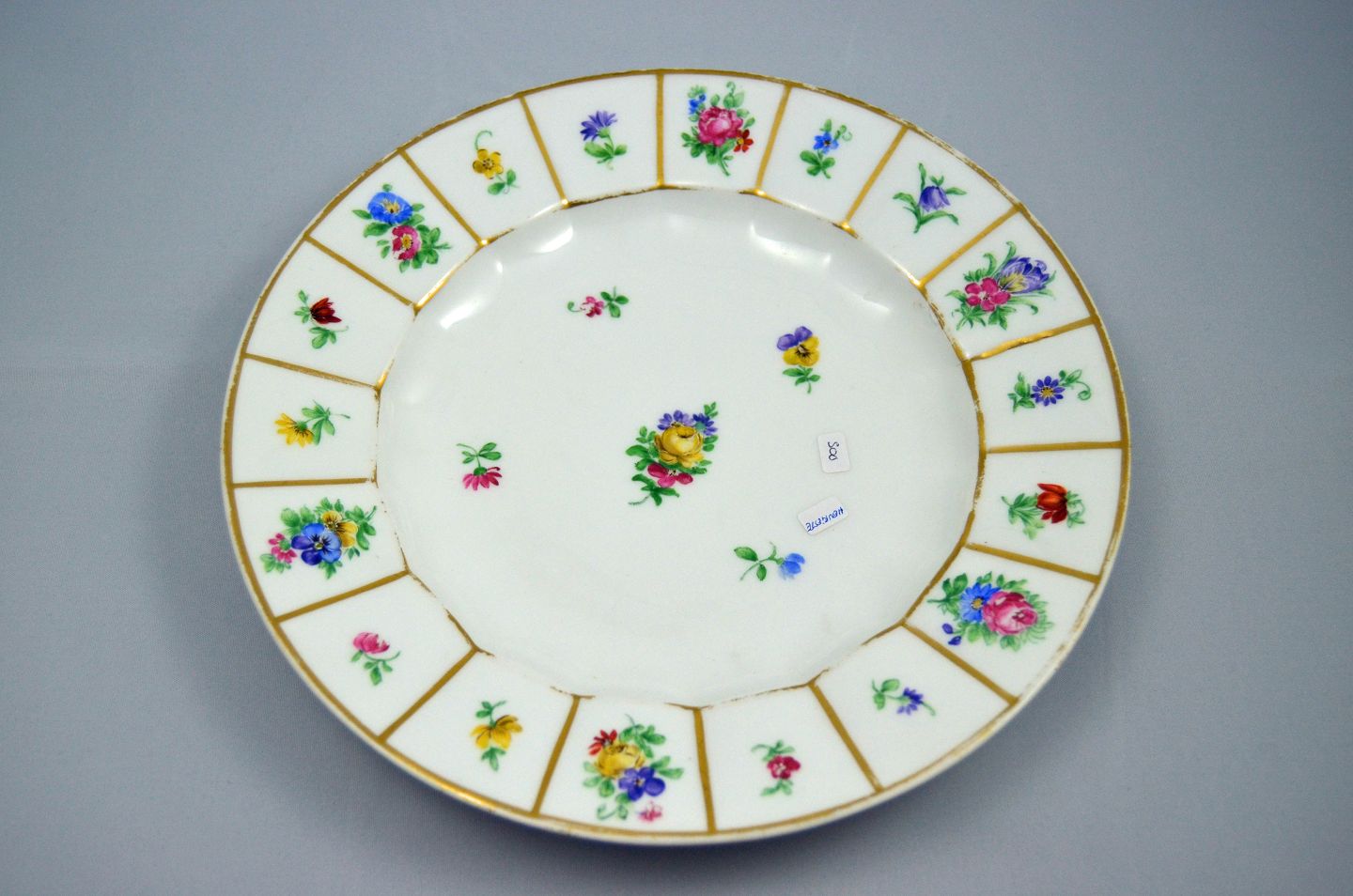 Rundt serveringsfad fra Royal Copenhagen fra Stellet Kgl. Henriette nr. 1884-00. Fadet er intakt med brugsspor. Pris: 500 kr. Fadets diameter er 25,4 cm. Varenr. 197576