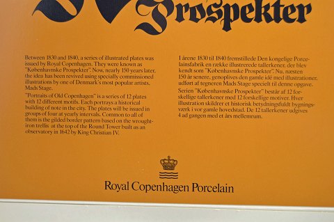 Platter fra Royal Copenhagen med motiver af Københavnske prospekter. Serien 'Københavnske prospekter' består af 12 platter/tallerkner, som hver især viser et motiv af et betydningsfuld historisk bygningsværk beliggende i København. Motiverne er tegnet af Mads Stage i 1977.