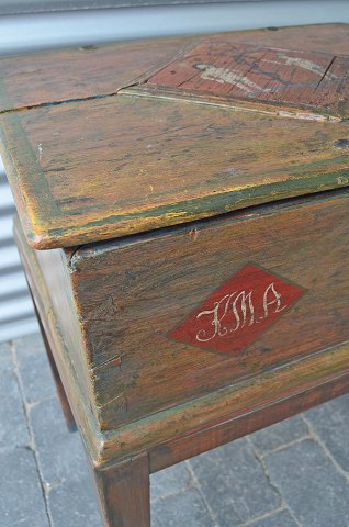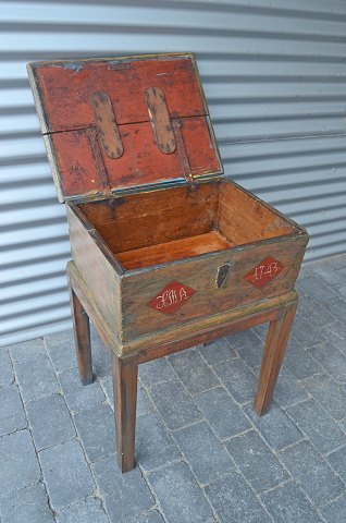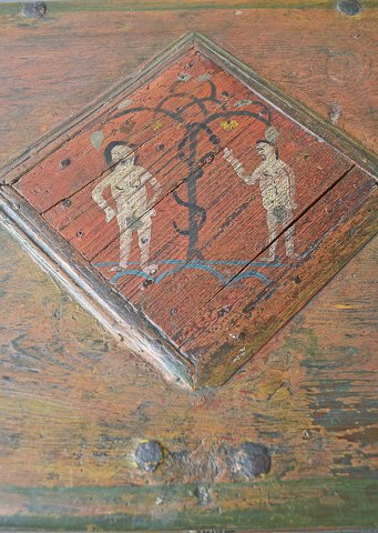 Antik kiste med højt understel og fint håndmalet motiv af Edens Have. Kisten er signeret K.M.A. år 1743. Kisten er løst placeret på understellet, som er af nyere dato.