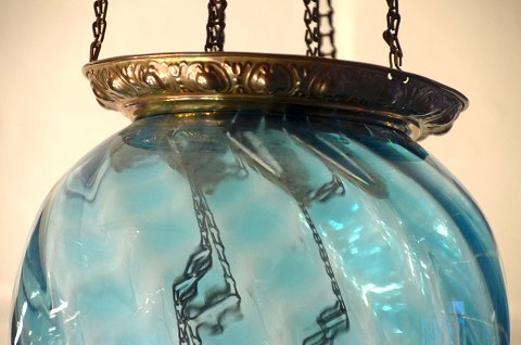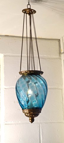 Den består af blåt facetteret glas, som er monteret på forgyldt messingblik. Den fremstår meget velholdt med intakt glas.