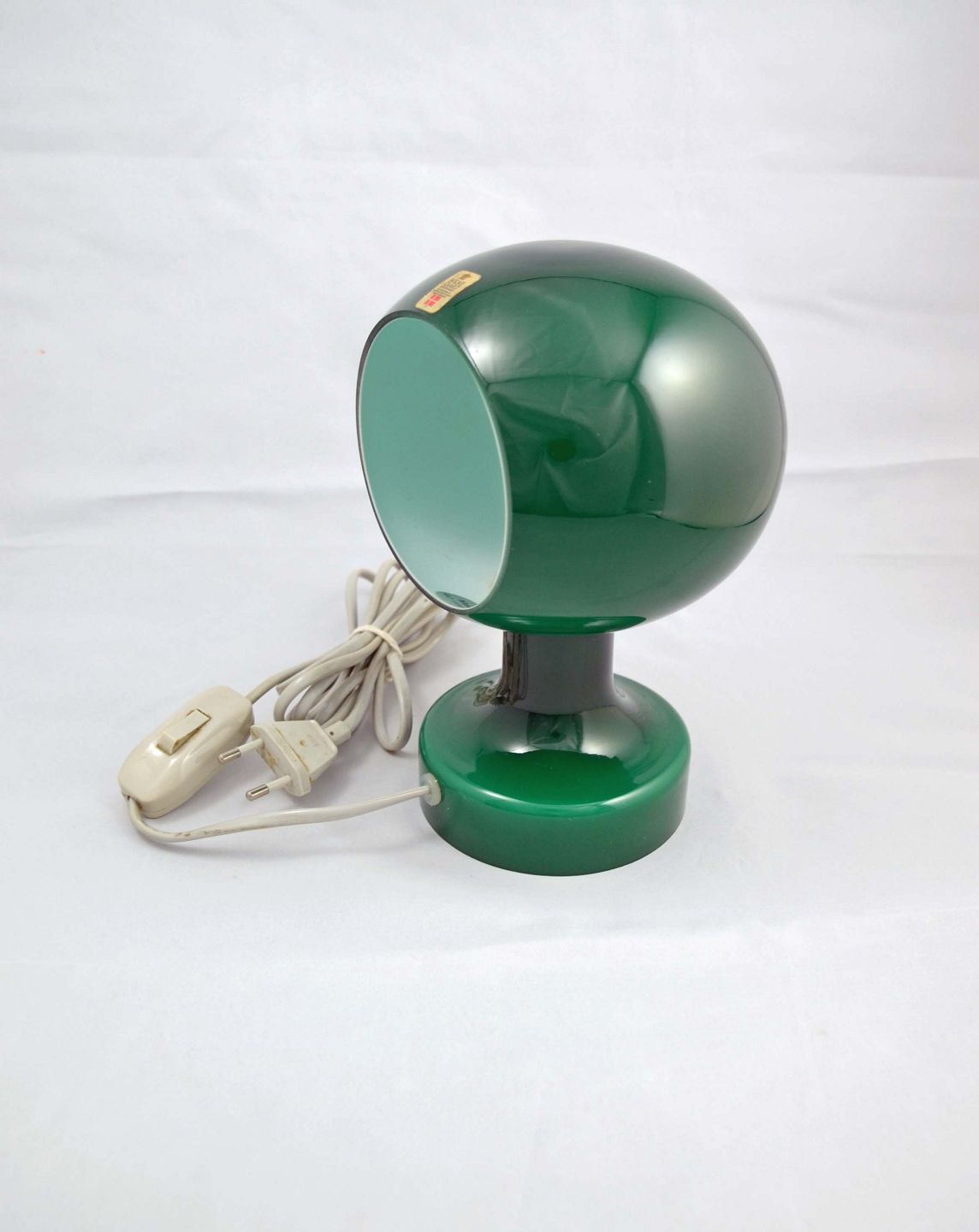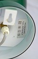 Kuglelampen er udformet i grønt glas med hvidt glas på indersiden.