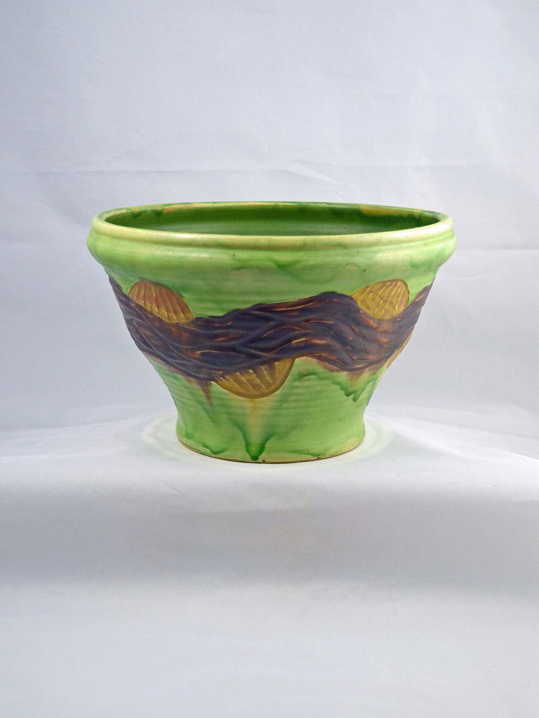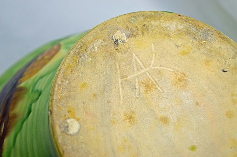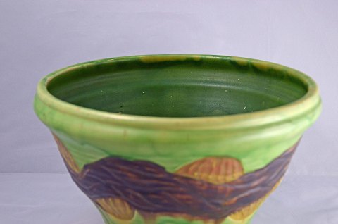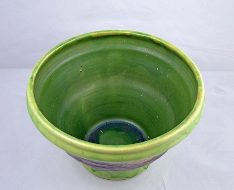 Høj keramikskål af Herman A. Kähler. Skålen er i pæn stand. Den har tre minimale nøk i glasuren. Højde: 17 cm. Ø: 26 cm.