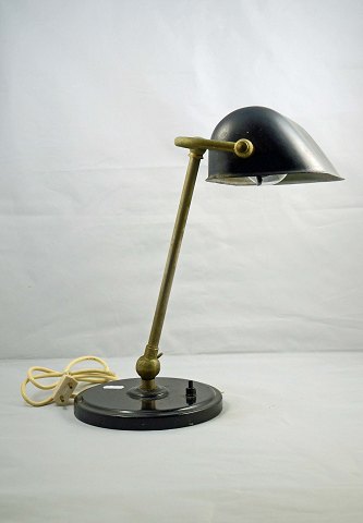 Bordlampe med solid bund af støbt jern. Lampens stamme kan reguleres i hældningen og skærmen er drejbar. Lampen er funktionel og i pæn stand. Højde: 36 cm. Bredde: 28 cm.