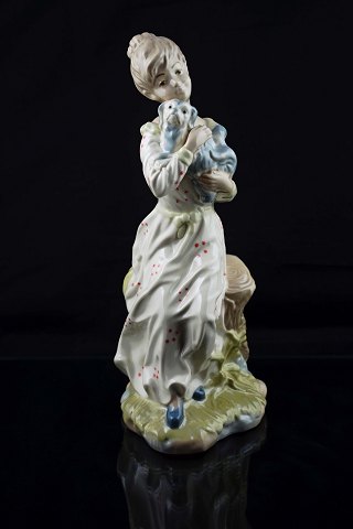 Spansk figur i porcelæn med motiv af stående kvinde med hund