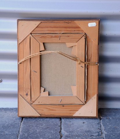 Maleri på lærred af indendørsmiljø. Lille afslag i rammen. Pæn stand.