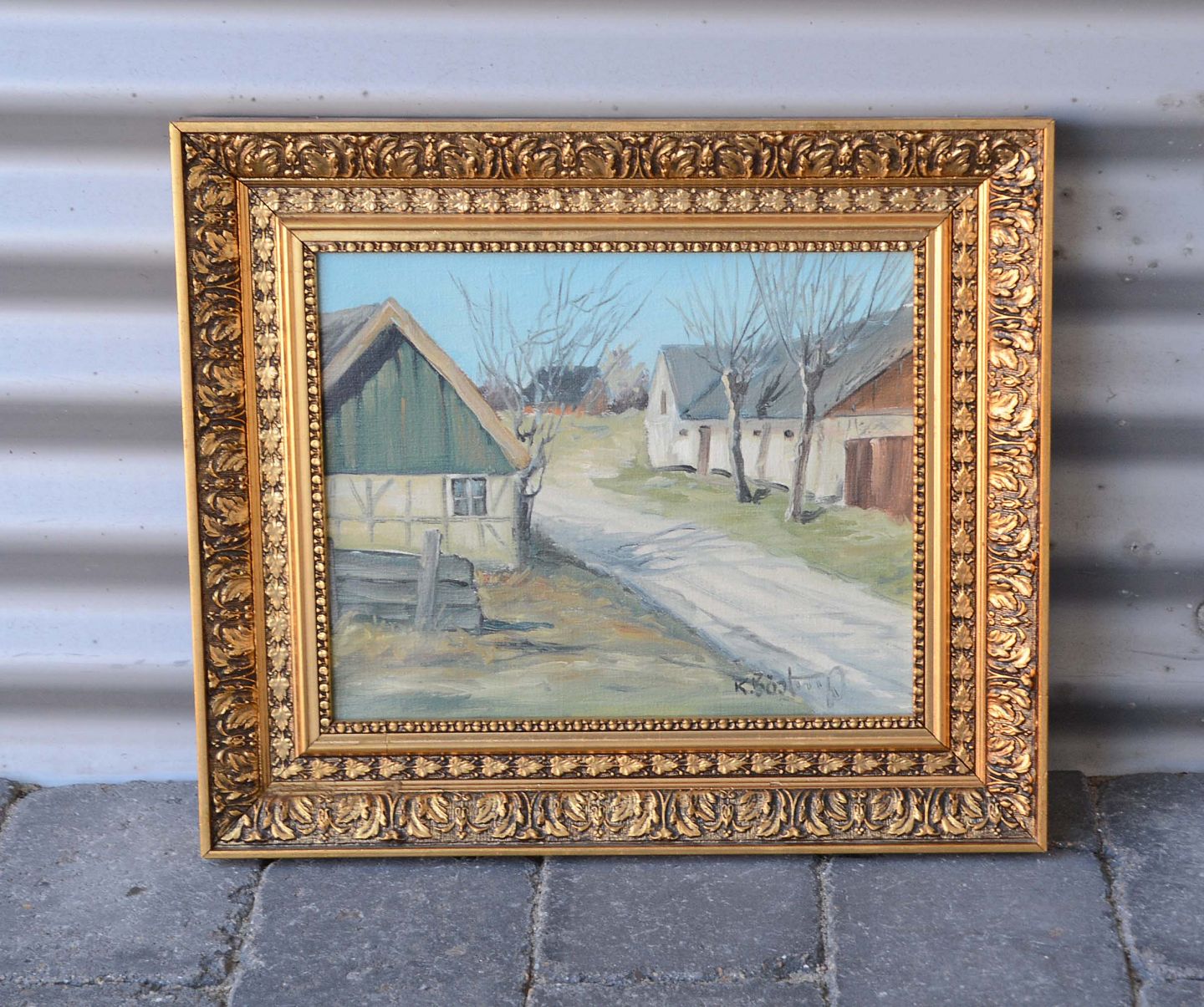 Maleri på lærred af Knud Bøstrup. Motiv huse ved vej. Signeret " K. Bøstrup". Meget pæn stand. Aldersrelaterede brugsspor.
