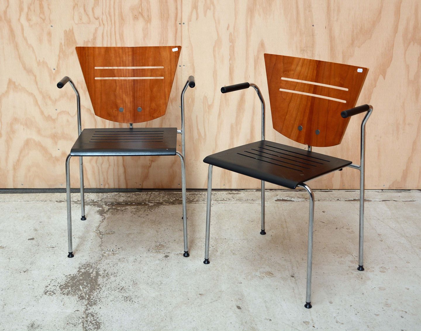 CAT konference-stole fra Rumas, Denmark designet af arkitekt Troles Grum-Schwensen. Stel af crom med træsæder og slidstærke håndtag af purgummi. Kan stables. Lette brugsspor ellers i pæn stand.
