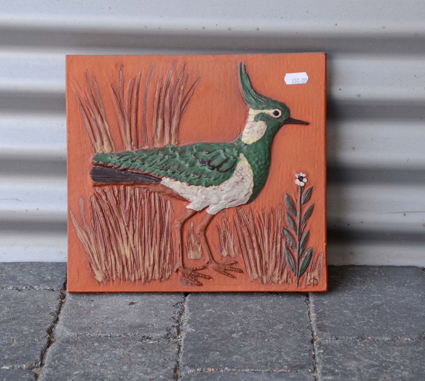 Relief (nr. 906/829) i keramik fra Knabstrup. Motiv af vibe. Mindre afslag på kanten. Pæn stand.