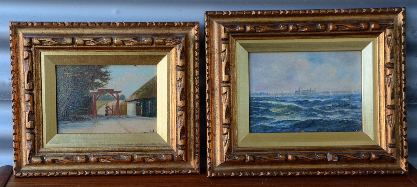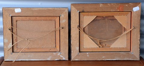 2 stk. Landsskabsmotiver. Olie på træplade. Pæn stand. Enkelte brugsspor.
