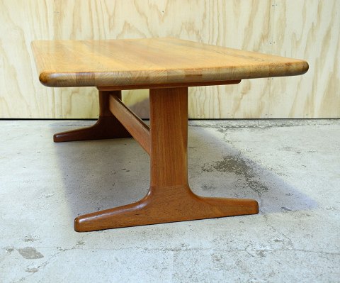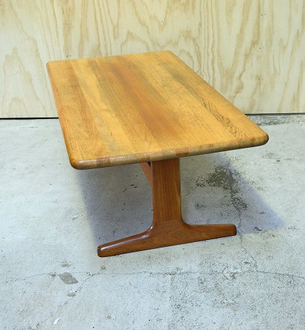 Lakeret sofabord i massiv teaktræ. Brugsspor på bordpladen - solblegning og enkelte overfladiske nøk. Pæn brugt stand.