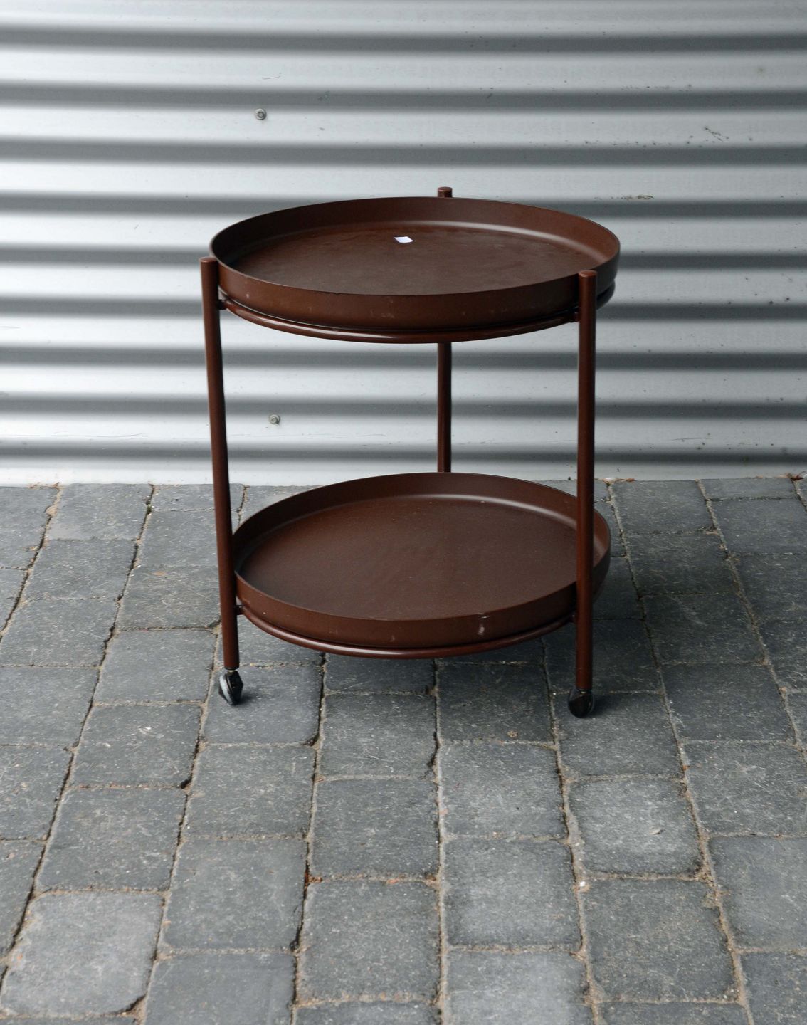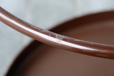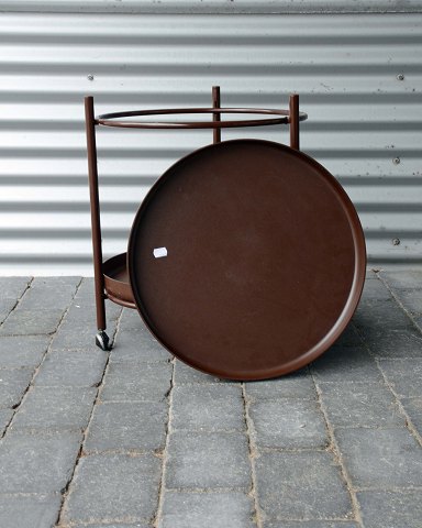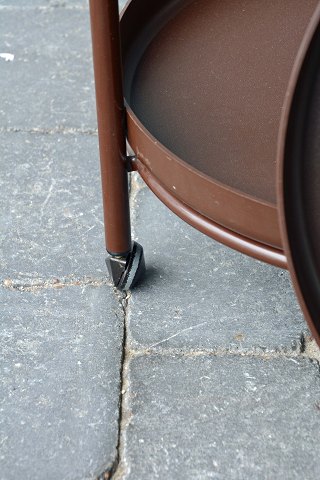 Bakkebord med flytbar bakke i plast og stel af brunt lakeret metal. Brugsspor.