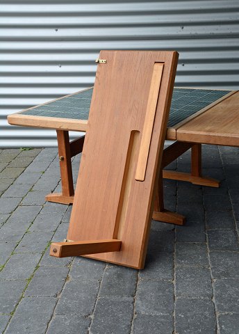 Sofabord i egetræ med Azur kakler. Design Jens Harald Quistgaard. Produceret hos Nissen. To ekstra tillægsplader med indbyggede ben. Brugsspor.
