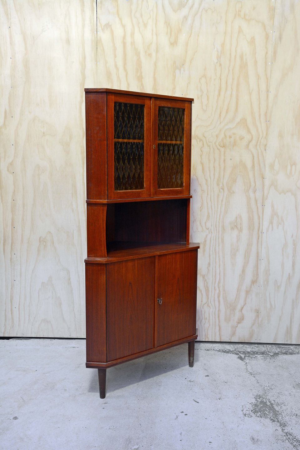 Hjørneskab i teak med mønstret ruder. Brugsspor.