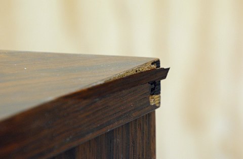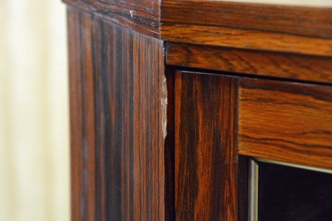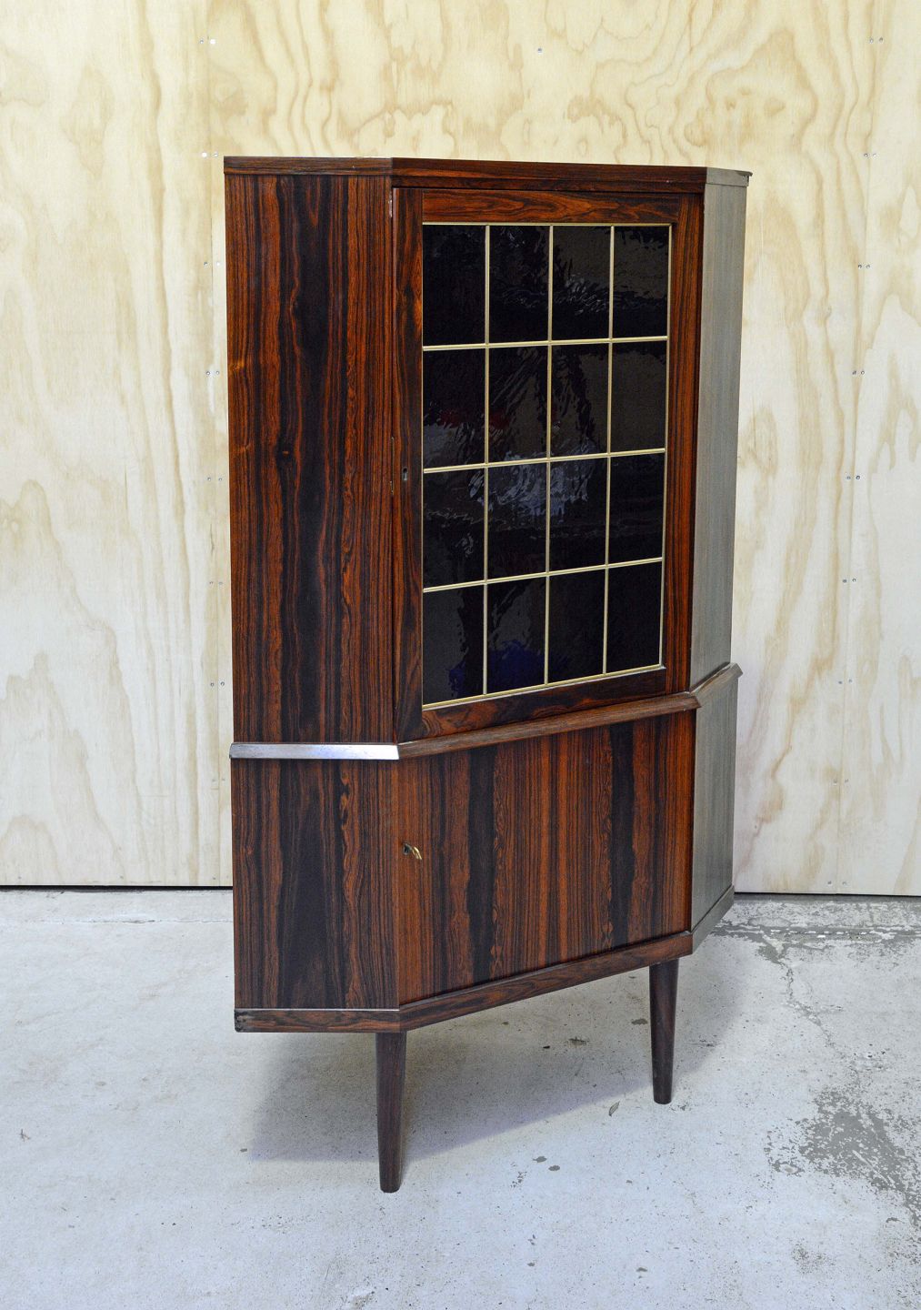 Hjørneskab i palisander. Brugsspor - ridser og nøk i træet.