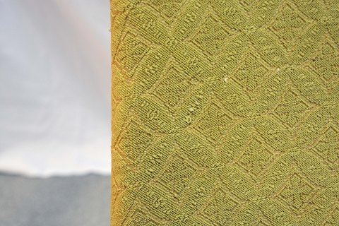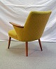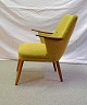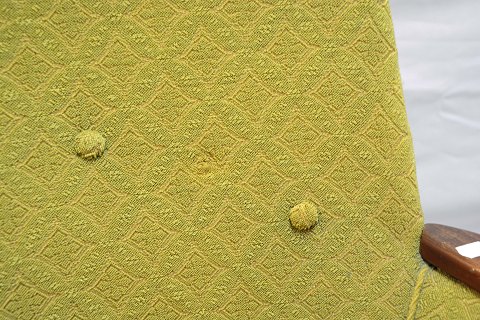 Armstol i teaktræ med grønt stofbetræk. Dansk møbelfabrikant. Brugsspor på ben og mangler en knap.