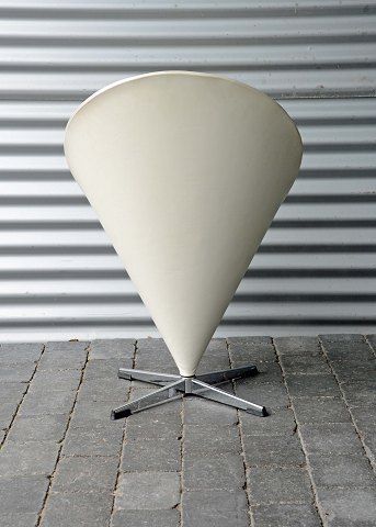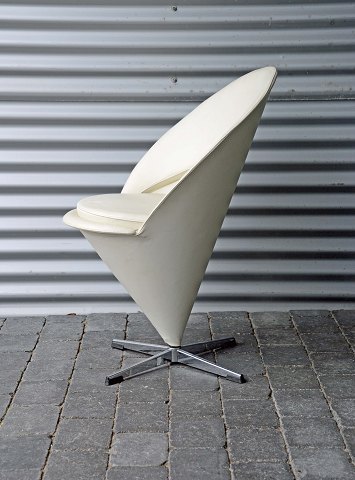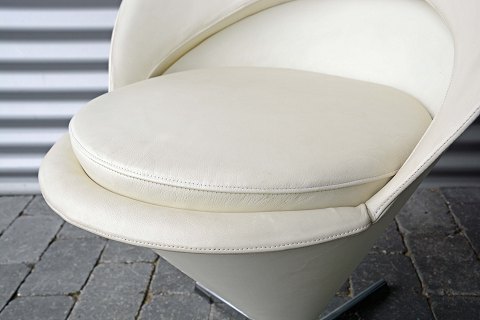 Kræmmerhus stol designet af Verner Panton. Cone stolen er betrukket med lyst læder. Intakt læder. Kræmmerhuset fremstår med minimale brugsspor.