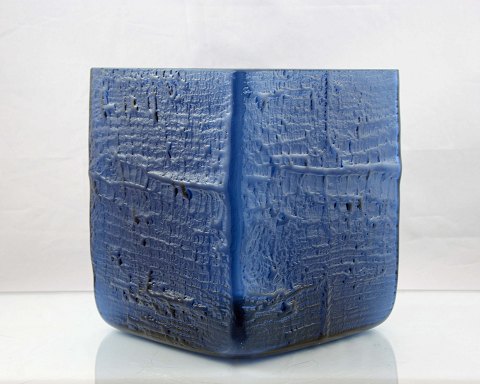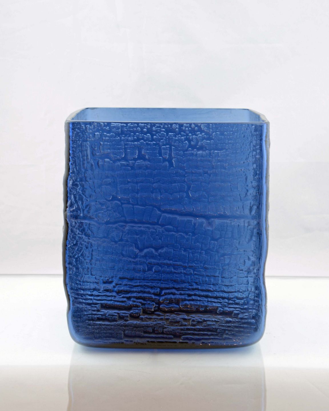 Firkantet blå vase i struktureret glas. Vasen kan også bruges som urtepotteskjuler. Intakt.