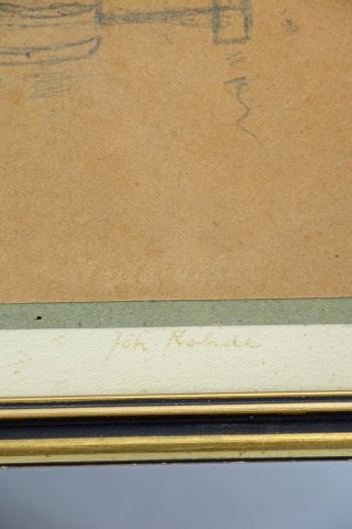 Indrammet Tegning med motiv af sejlbåde i havneområde af Johan Rohde. Signeret. Brugsspor på rammen.