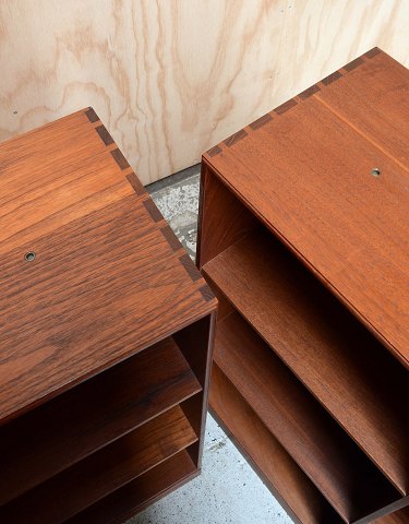 To Bogkasser/reoler i teaktræ designet af Mogens Koch og fremstillet ved Rud Rasmussens Snedkeri. Intakte med enkelt brugsspor (ridser) på hylder.