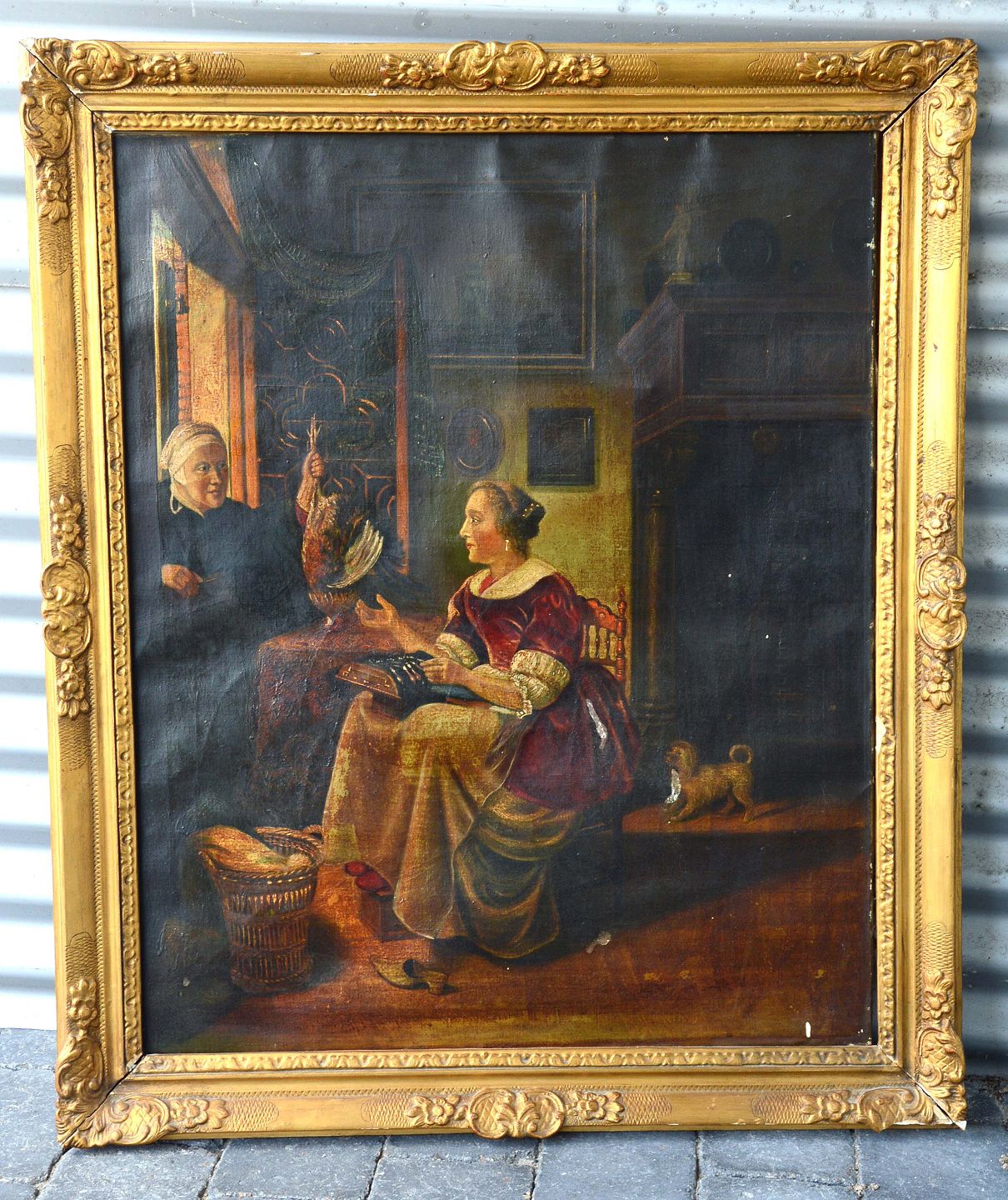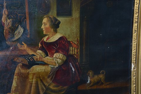 Maleri på lærred med motiv af arbejdende kvinder. Maleriet fremstår usigneret med brugsspor på rammen og maleriet.