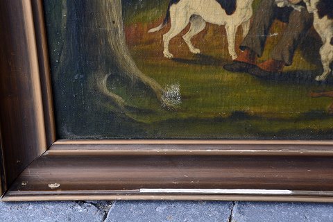 Maling på lærred med jagtmotiv. Utydelige signatur. Fremstår med brugsspor på rammen og krakeleringer mv. på maleriet (se foto).