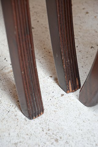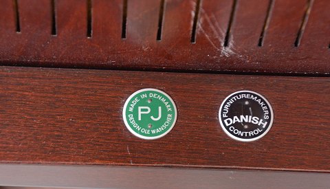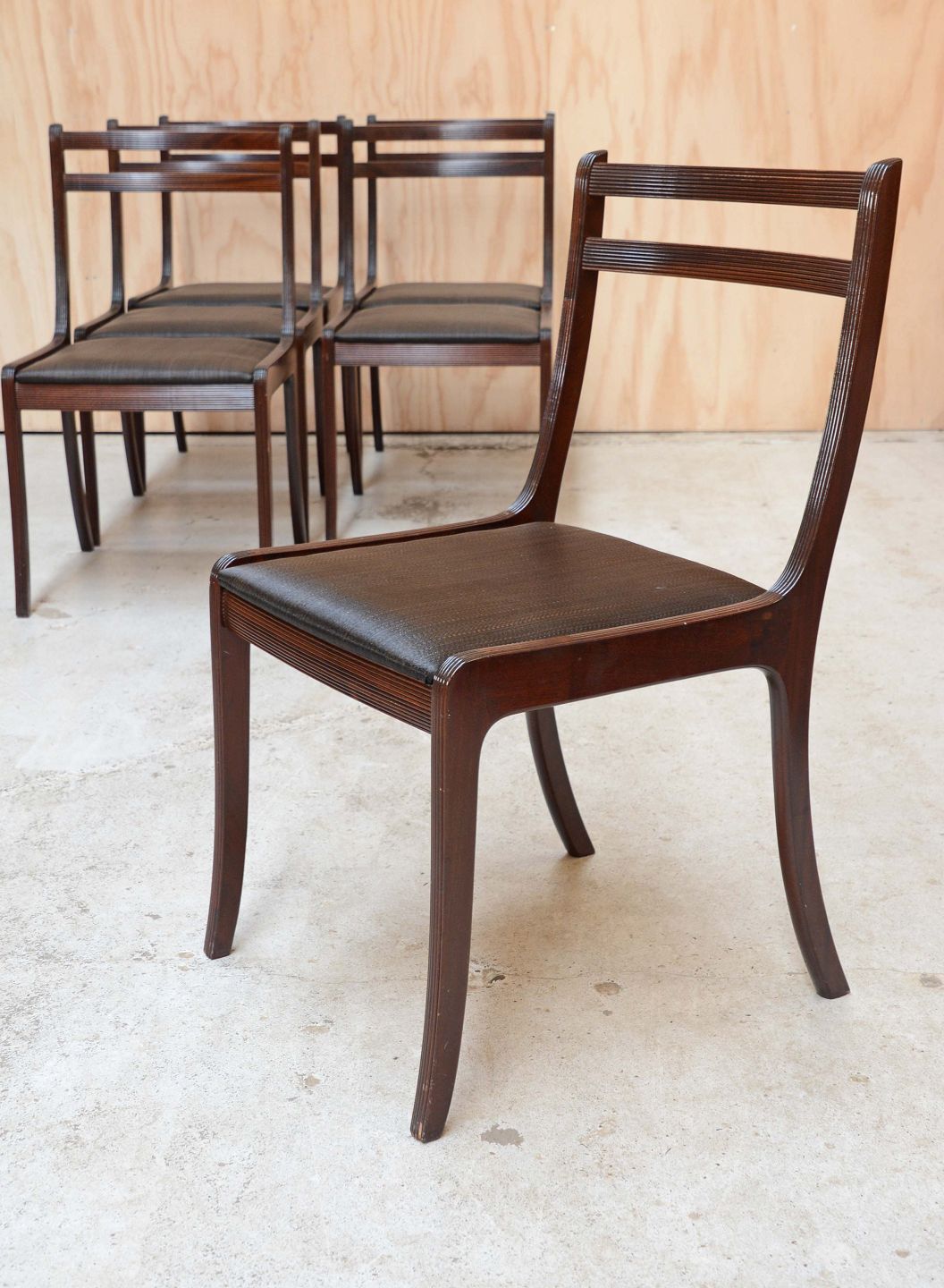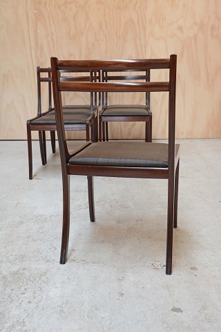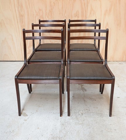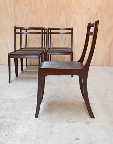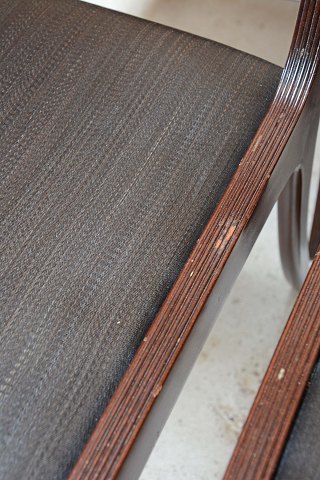 Sæt på 6 stole i mahogni med sæder af hestehår designet af Ole Wanscher. Mahognistolene fremstår med enkelte brugsspor på stellet og intakte sæder.