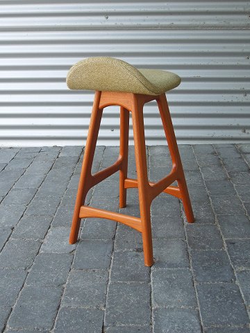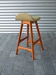 Lakeret teak skammel/barstol med polstret stofbetrukket sæde og stel i teaktræ.