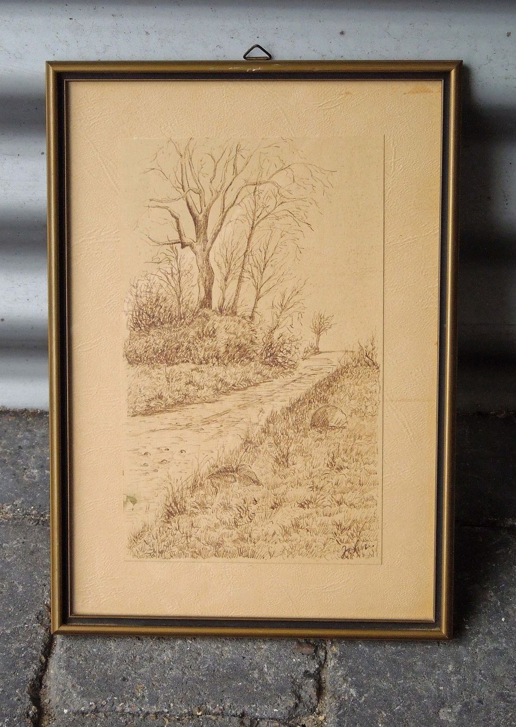 Indrammet tegning af naturområde med sti. Signeret John. B. Johannesen. Fremstår med brugsspor på rammen og intakt glas.