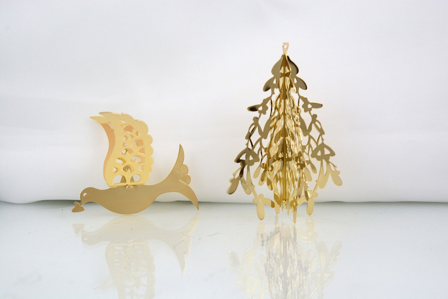 Georg Jensen julepynt. Grantræ og due udført i messing belagt med 24 karats guld. Christmas Collectibles designet af Karen Bit Vejle 2014.