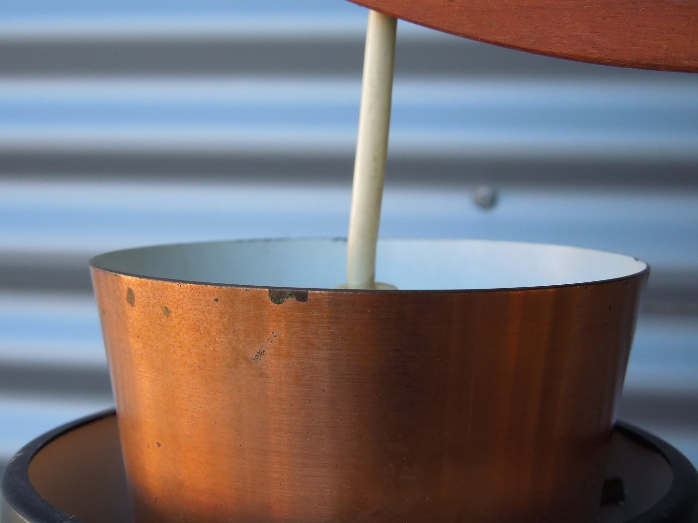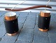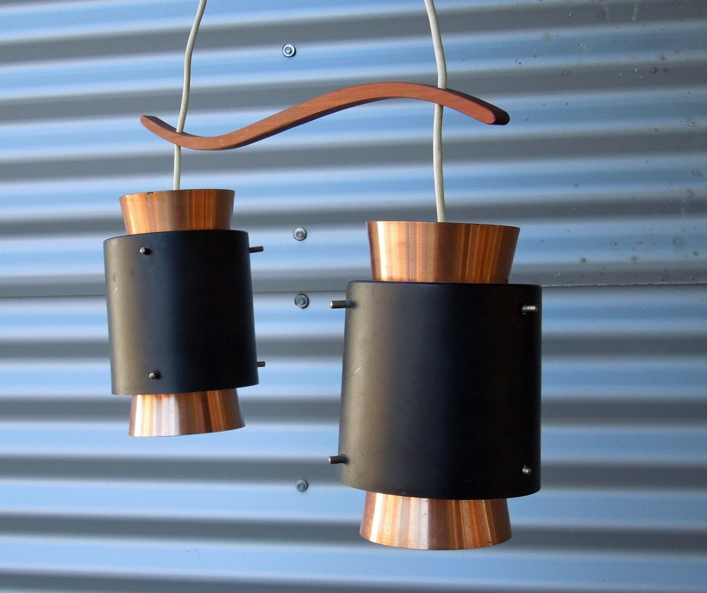 2 loftslamper på teak bøjle. skærme i sortlakeret og kobber-lakeret aluminium skærm.