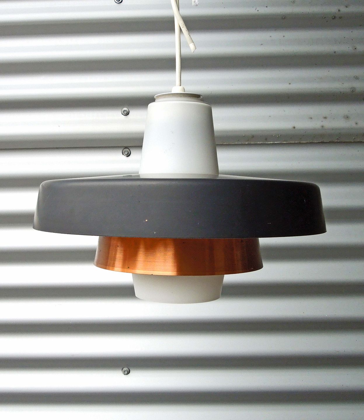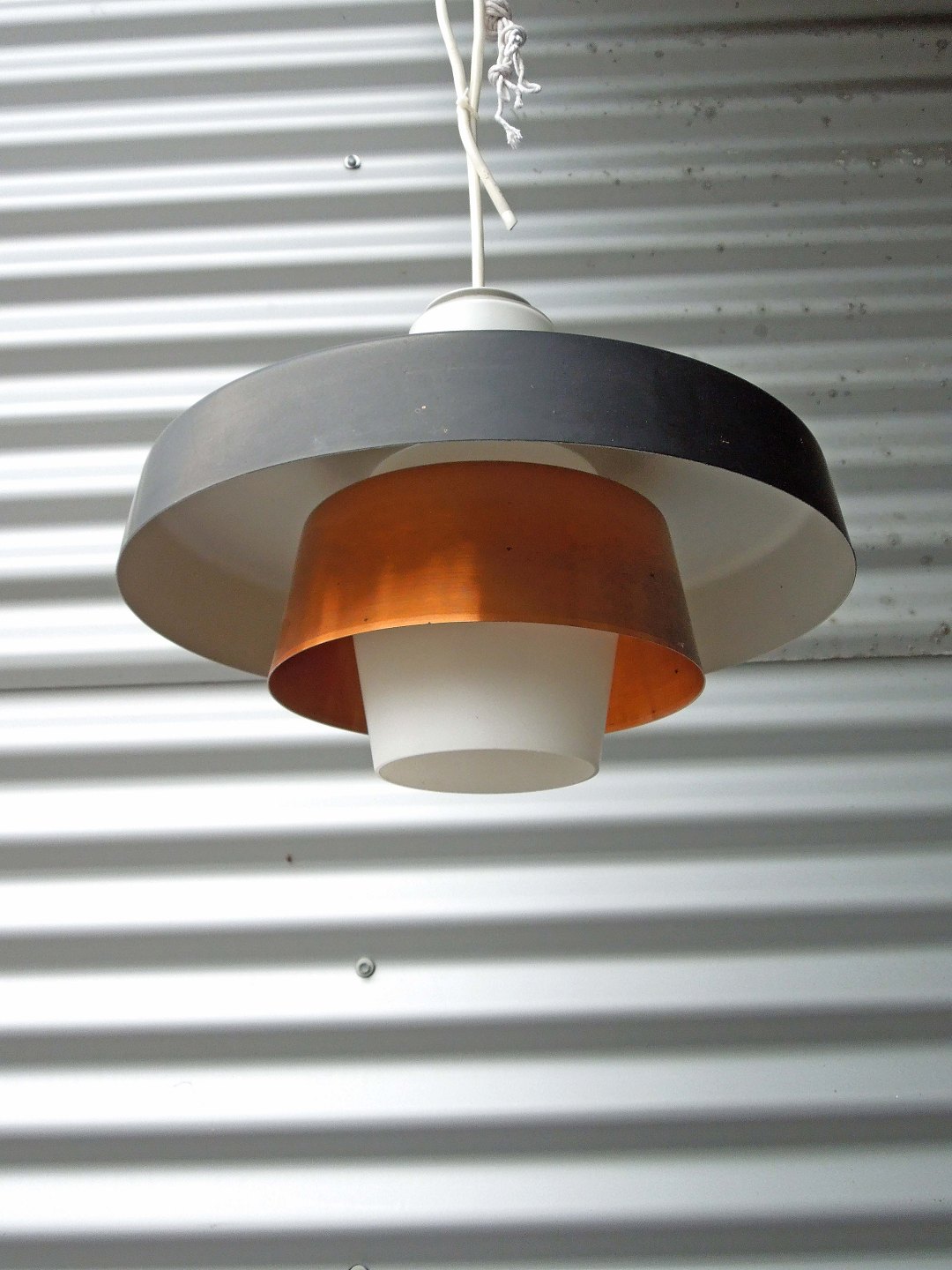 Pendel lampe med sortlakeret metalskærm med kobber og opalhvidt glas. Fremstår med brugsspor på skærmen. Glasset er intakt.