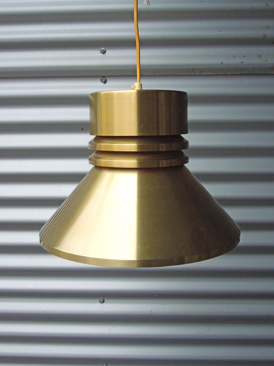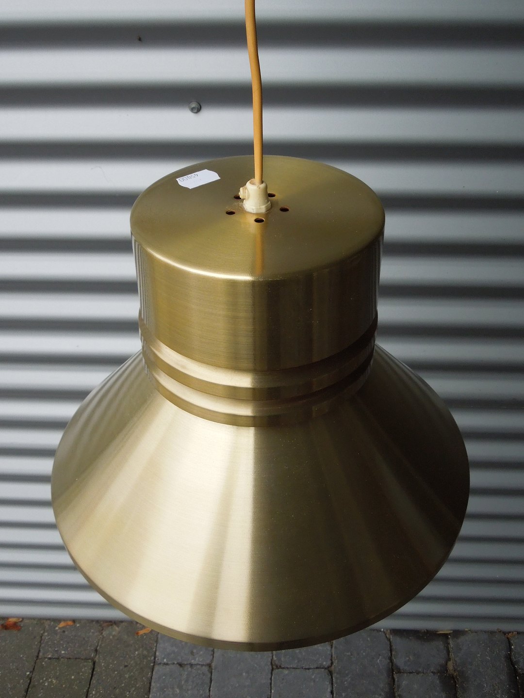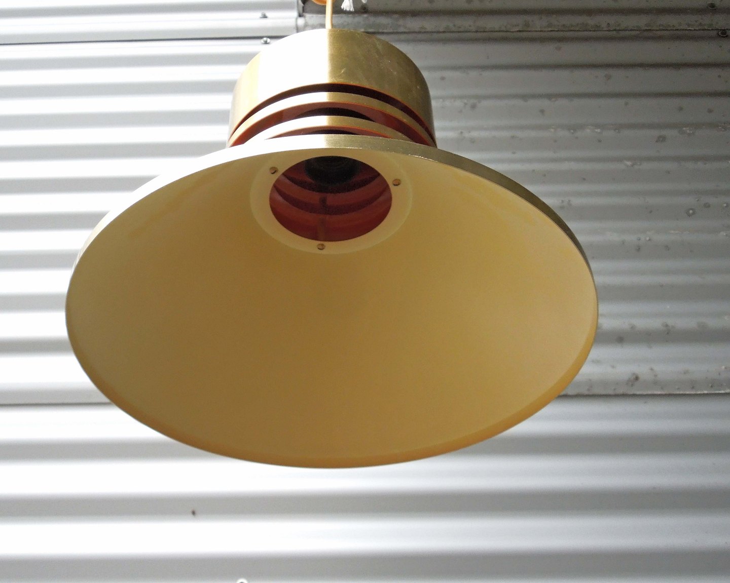 Loftslampe i messingfarvet med hvidlakeret underside og en brændt orange farve i lampens top. Fremstår med mindre brugsspor og trænger til rengøring.