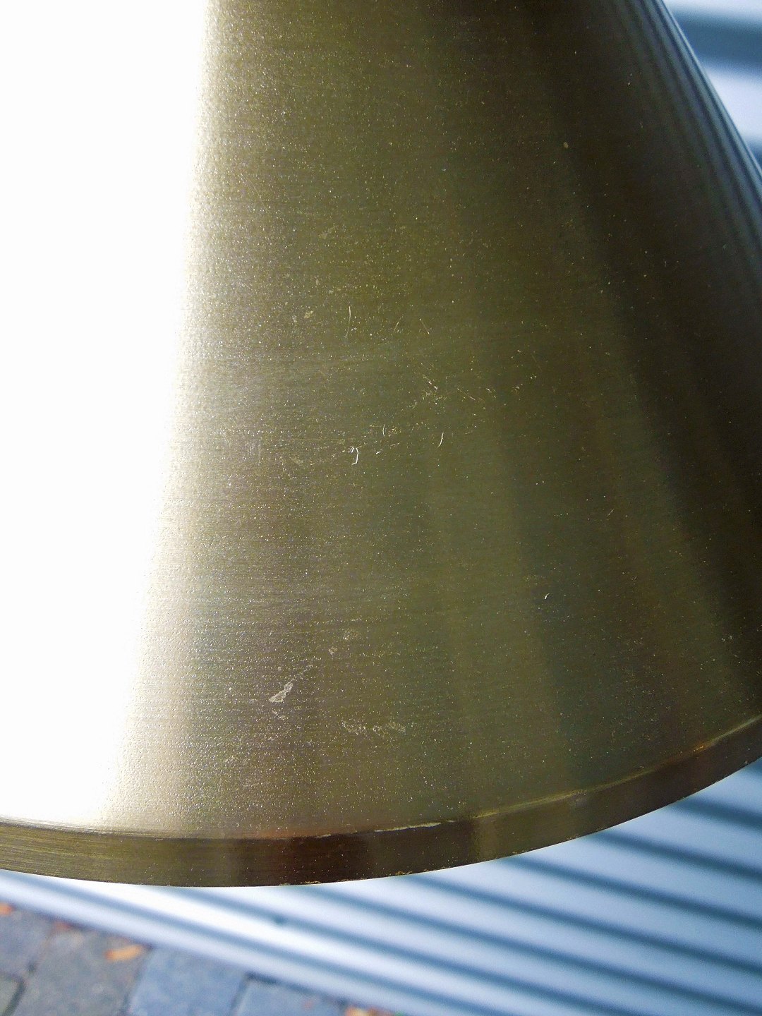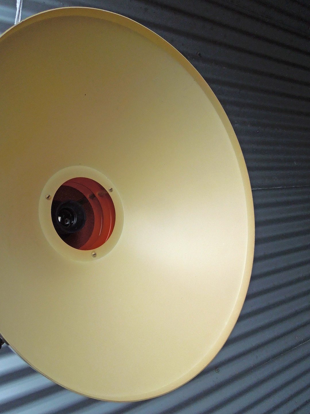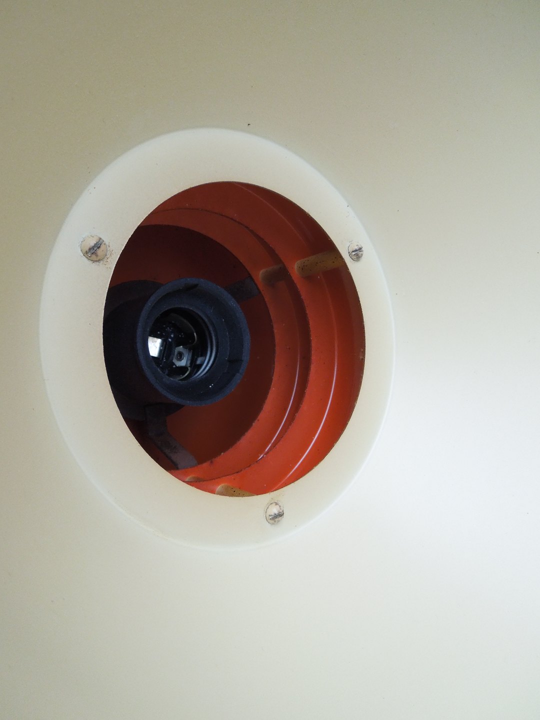Loftslampe i messingfarvet med hvidlakeret underside og en brændt orange farve i lampens top. Fremstår med mindre brugsspor og trænger til rengøring.