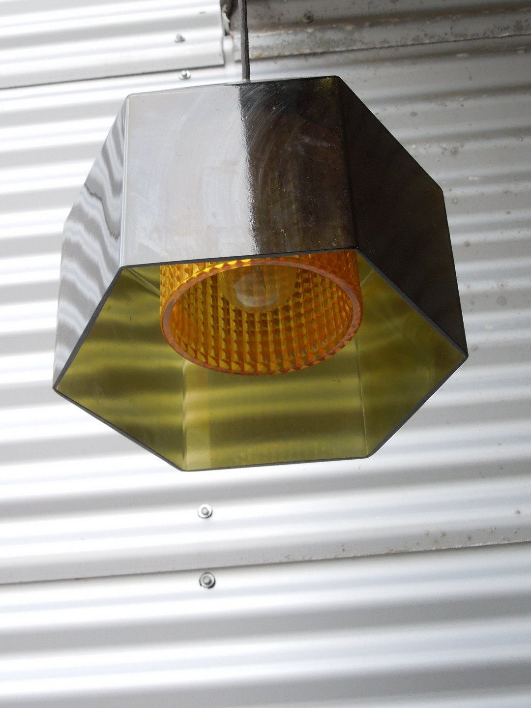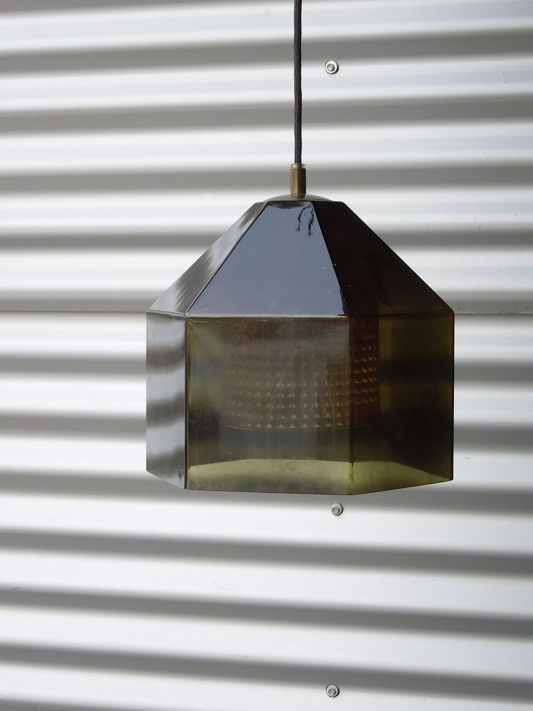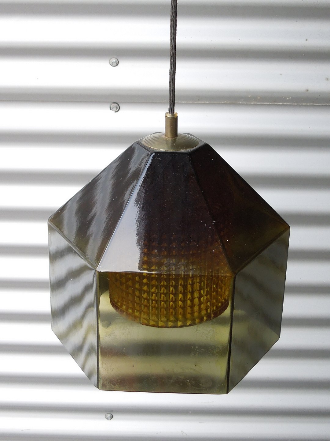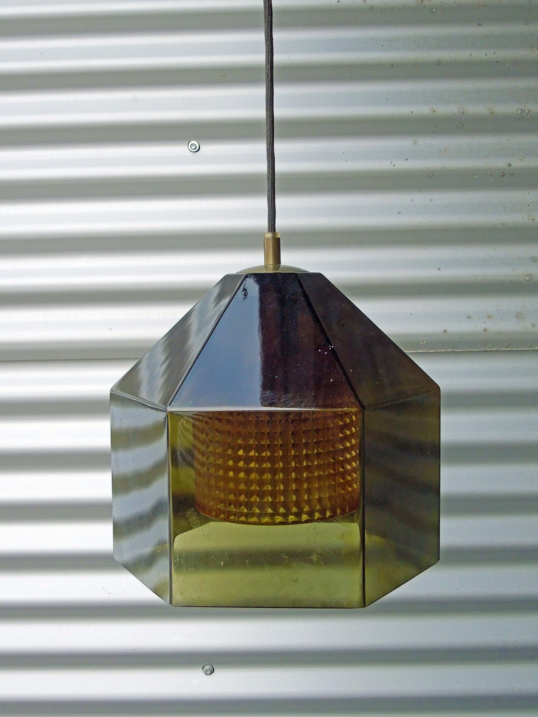 Lyfa/Orrefors sekskantet Pendel, grågrønt krystalglas og klart dobbelt korrugeret krystal inderst.